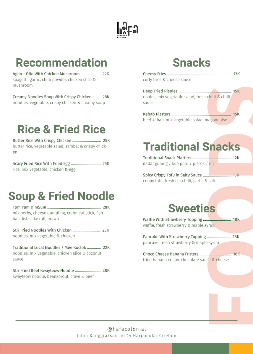 Welcome to Hafa Colonial, a charming café nestled in the heart of Harjamukti, Cirebon, where every visit is a delightful escape into a world of flavor and warmth. Located at Jl. Kanggraksan No.24, this inviting spot is not just about coffee; it embodies a vibrant atmosphere that makes you feel right at home from the moment you step inside.